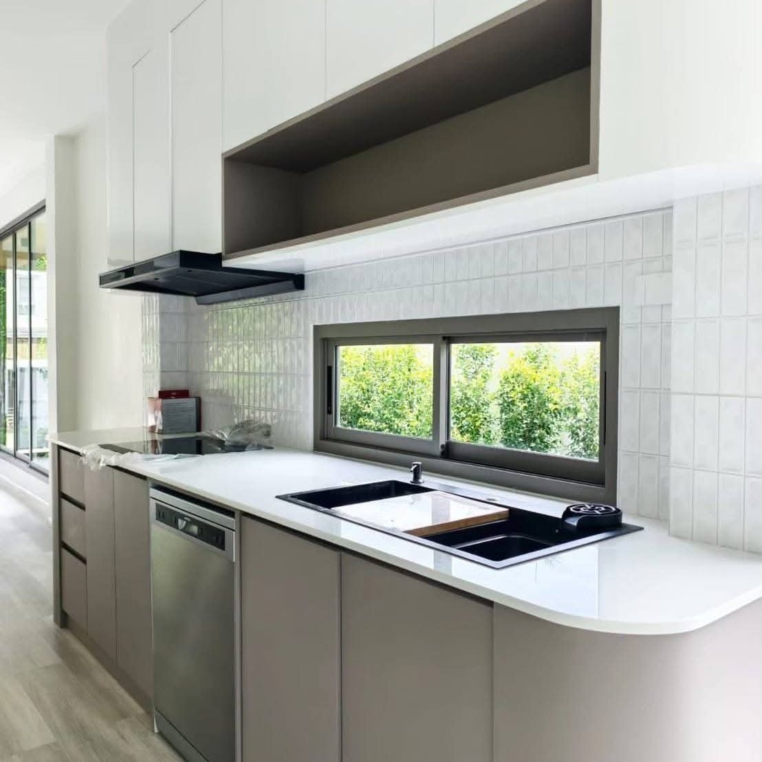 - Built-in gas stove with modern cooker hood