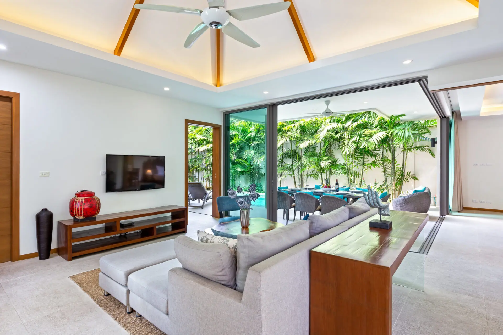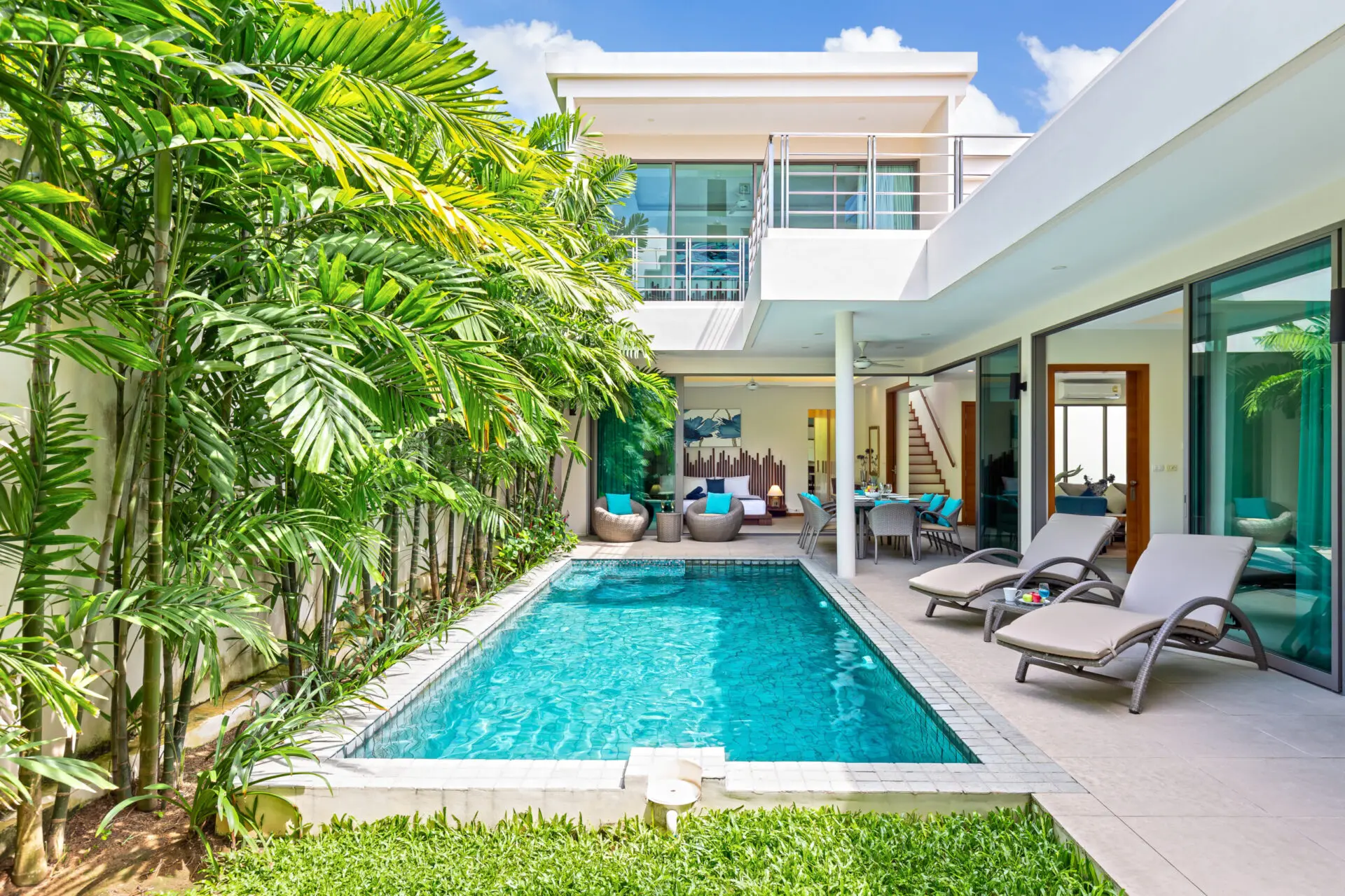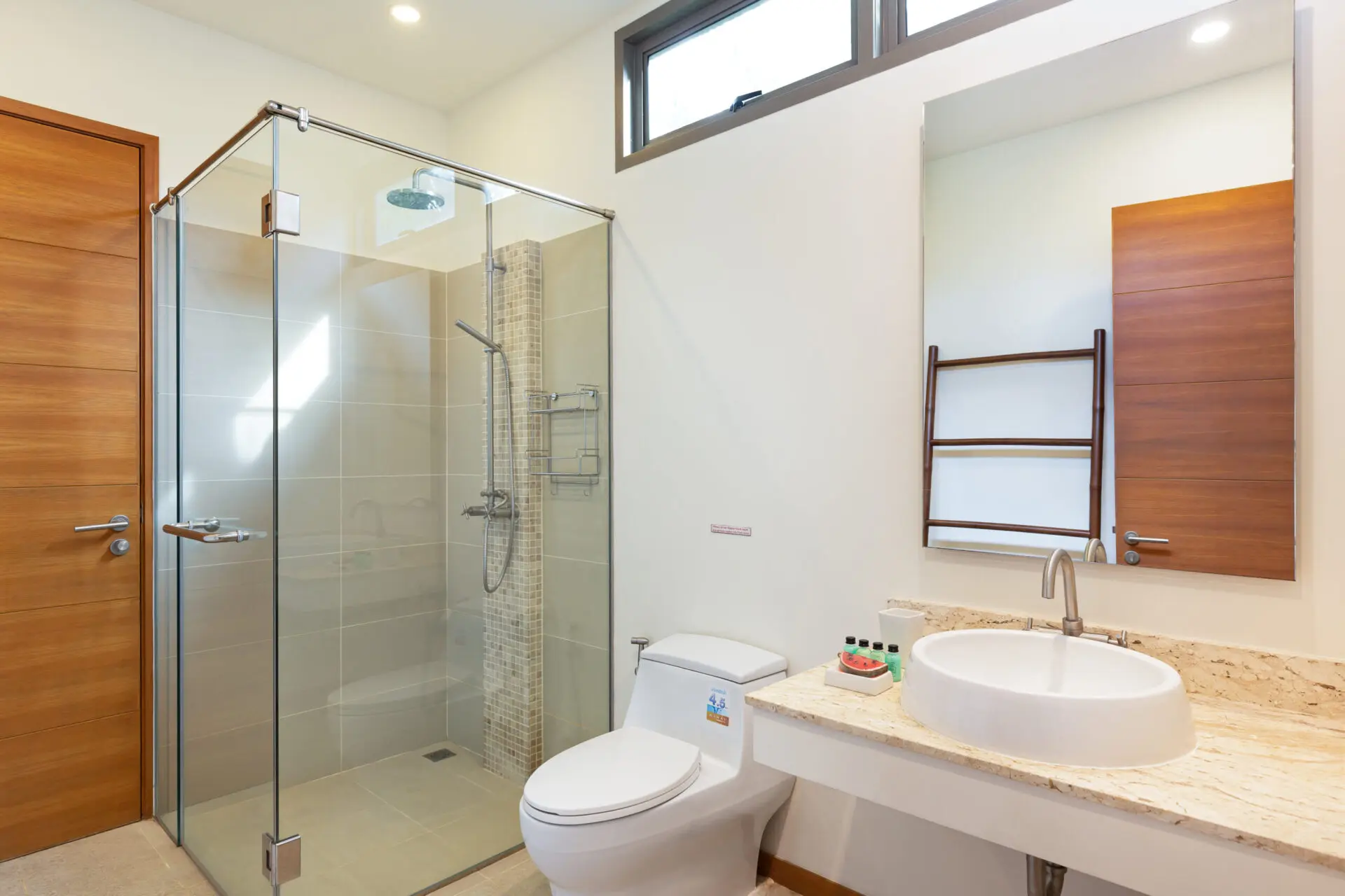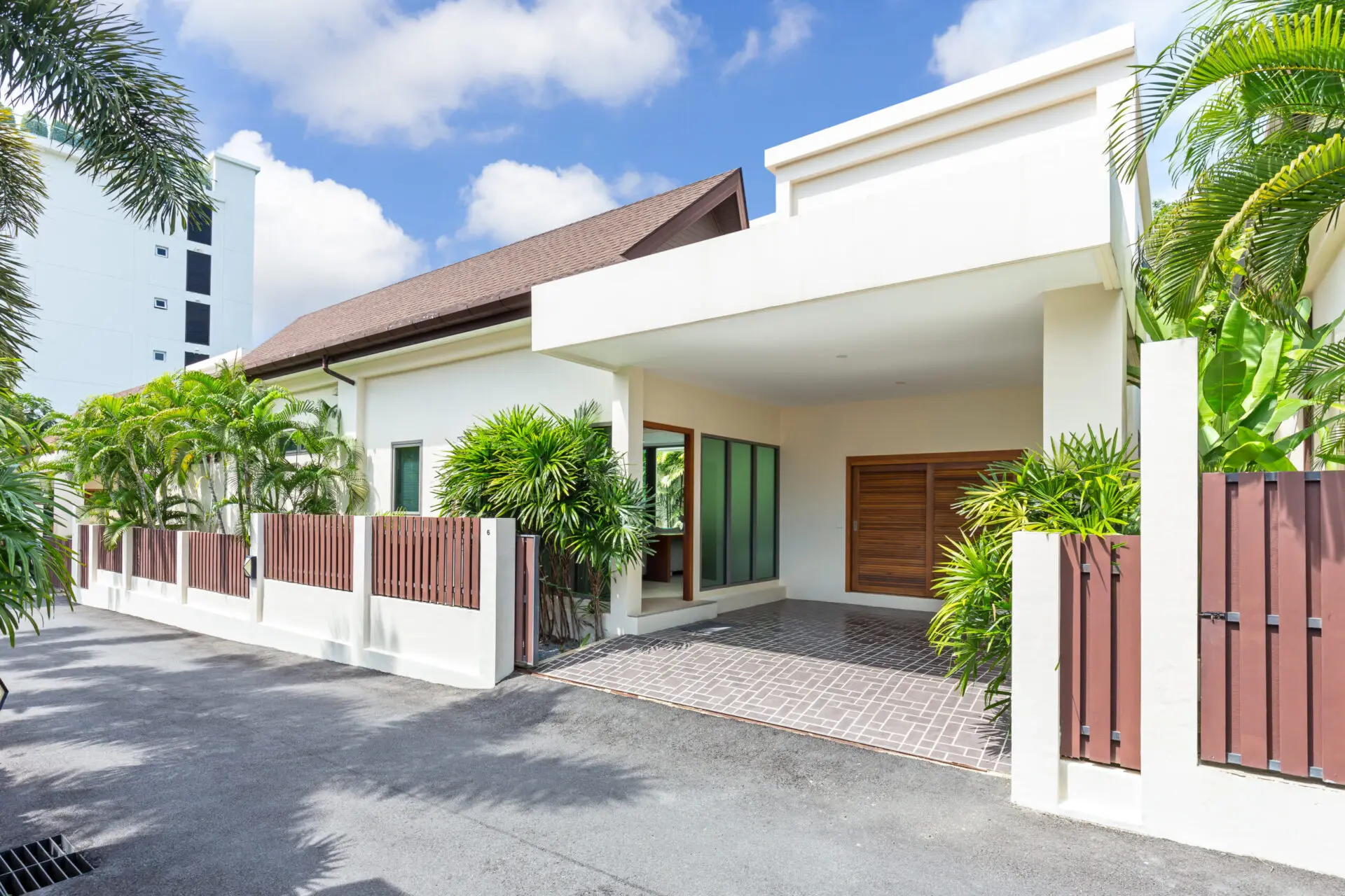The large four bedroom premium pool villa is very spacious yet still very affordable, offering two bedrooms on the lower level and two on the upper level, all of which can comfortably accommodate a king size bed or two twin size beds and each with their own private Ensuite bathroom. You still get the same open main floor living area that flows seamlessly with the outdoor covered dining area on the large terrace through wide opening ‘floor to ceiling’ sliding doors. All the main floor rooms look directly to the inviting pool with Jacuzzi. The oversize covered parking area in front of your villa has ample room for a car plus two motorbikes. There is also a large storage area for your bicycle, surfboard and a laundry machine. The villas come complete with lush tropical landscaping ensuring complete privacy around your pool while you enjoy a late evening dip.