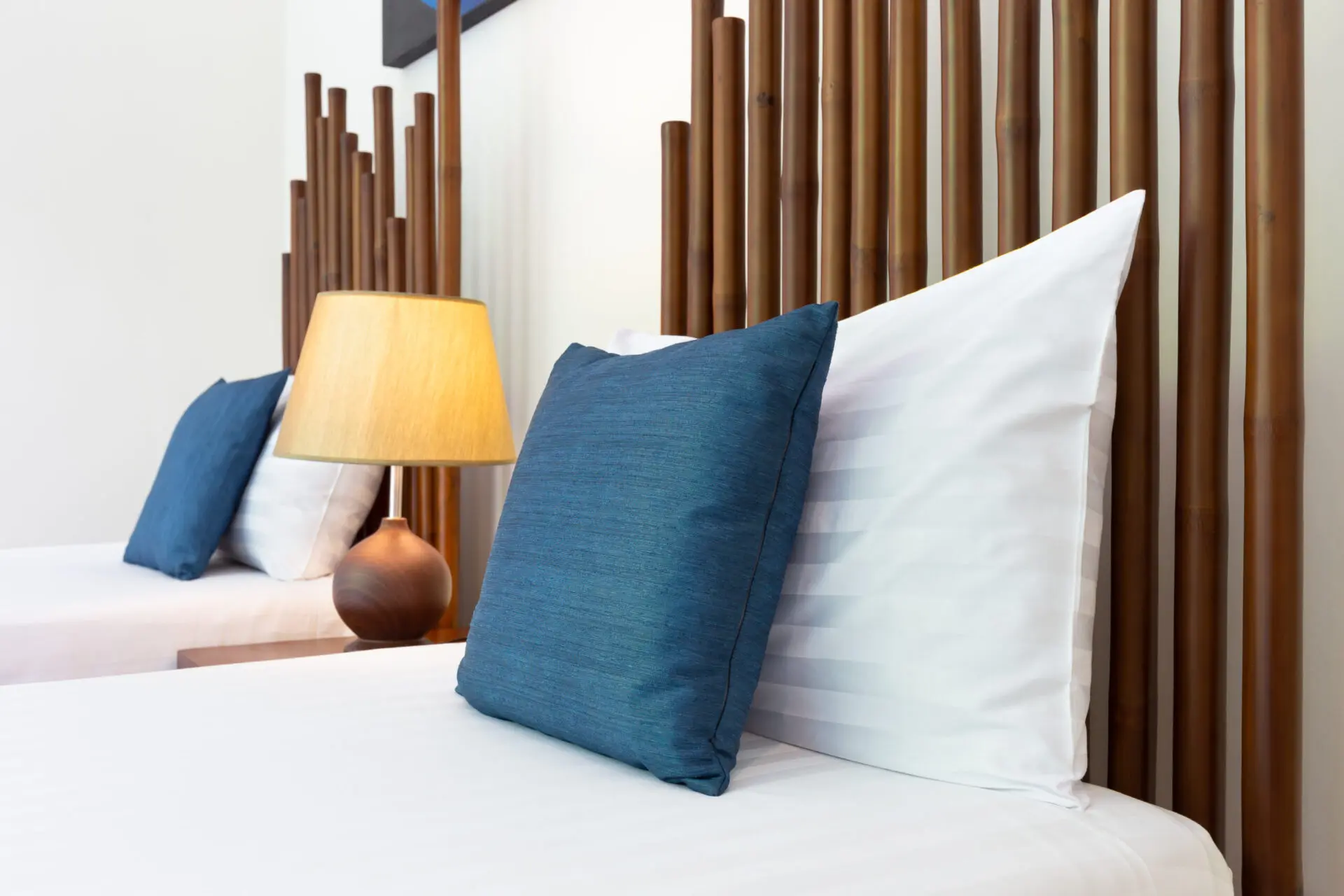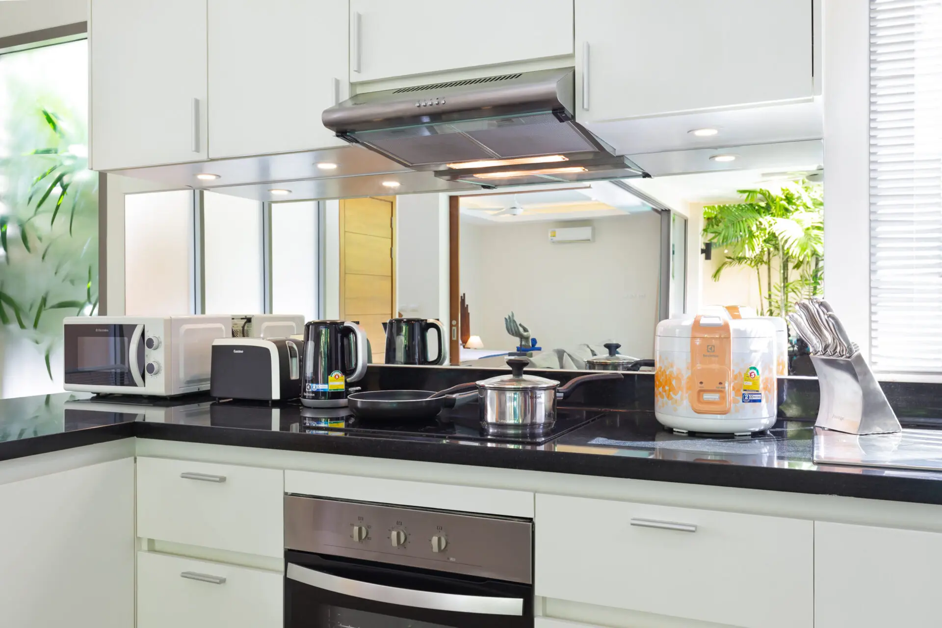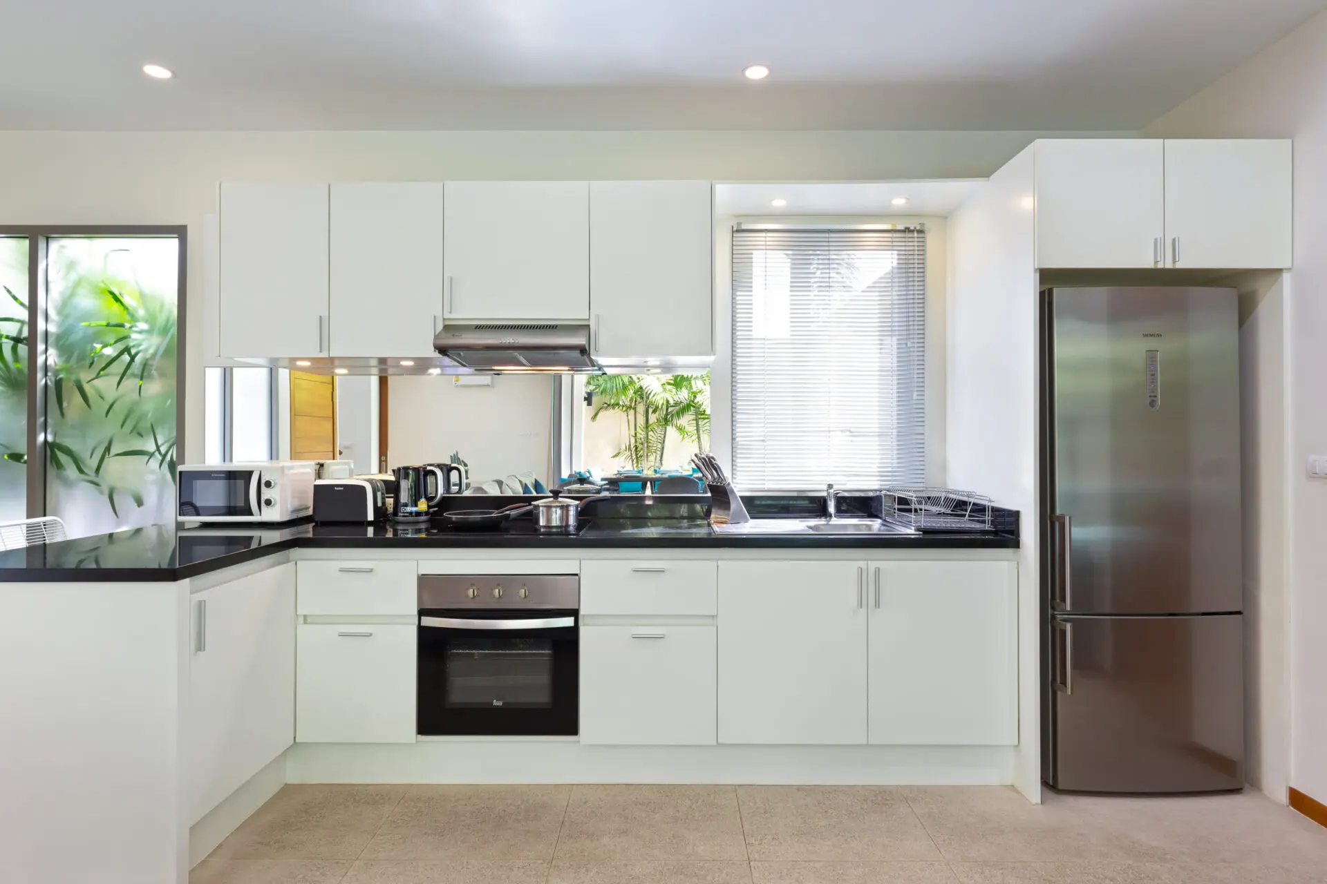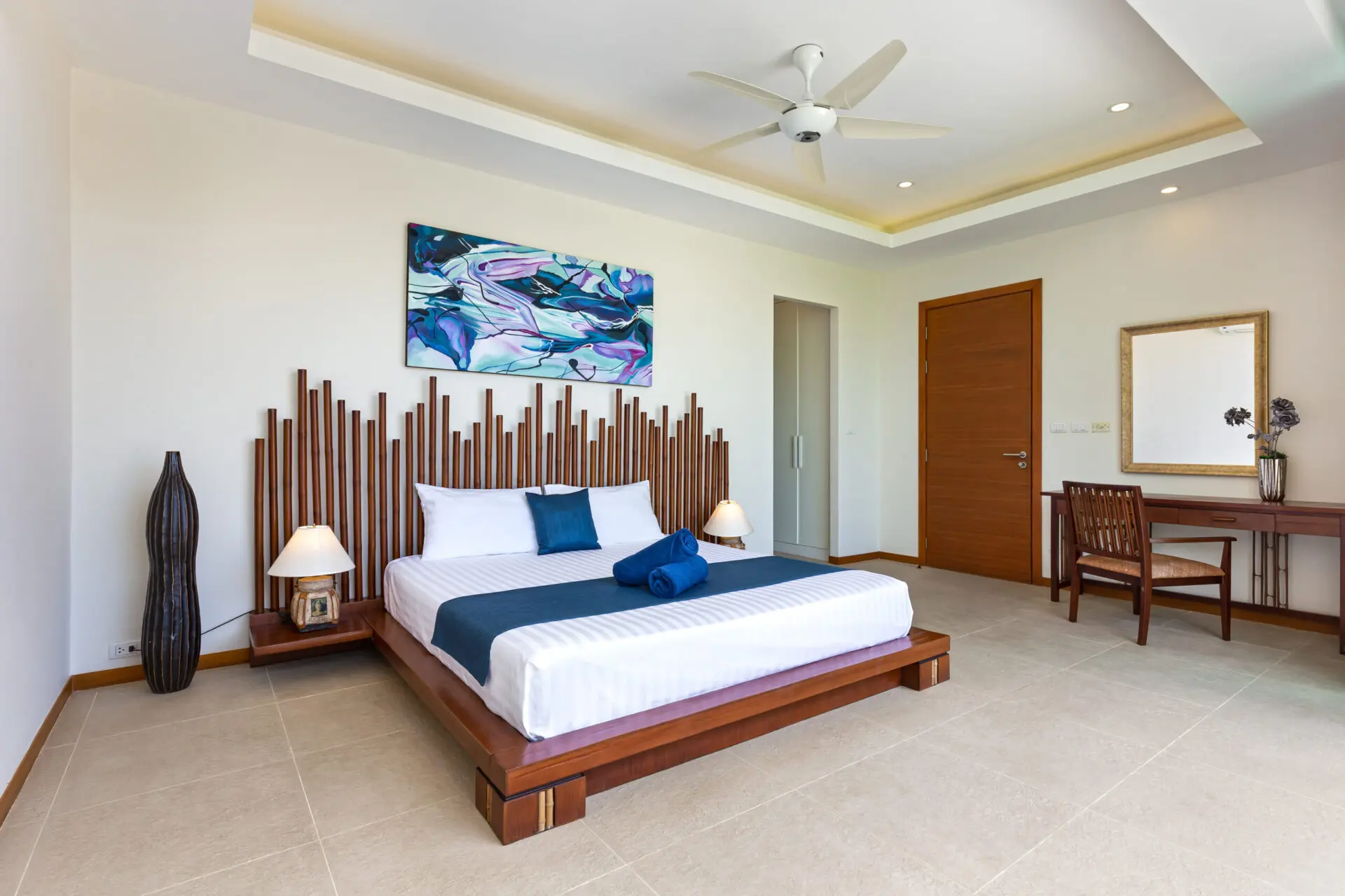 The large four bedroom premium pool villa is very spacious yet still very affordable, offering two bedrooms on the lower level and two on the upper level, all of which can comfortably accommodate a king size bed or two twin size beds and each with their own private Ensuite bathroom. You still get the same open main floor living area that flows seamlessly with the outdoor covered dining area on the large terrace through wide opening ‘floor to ceiling’ sliding doors. All the main floor rooms look directly to the inviting pool with Jacuzzi. The oversize covered parking area in front of your villa has ample room for a car plus two motorbikes. There is also a large storage area for your bicycle, surfboard and a laundry machine. The villas come complete with lush tropical landscaping ensuring complete privacy around your pool while you enjoy a late evening dip.