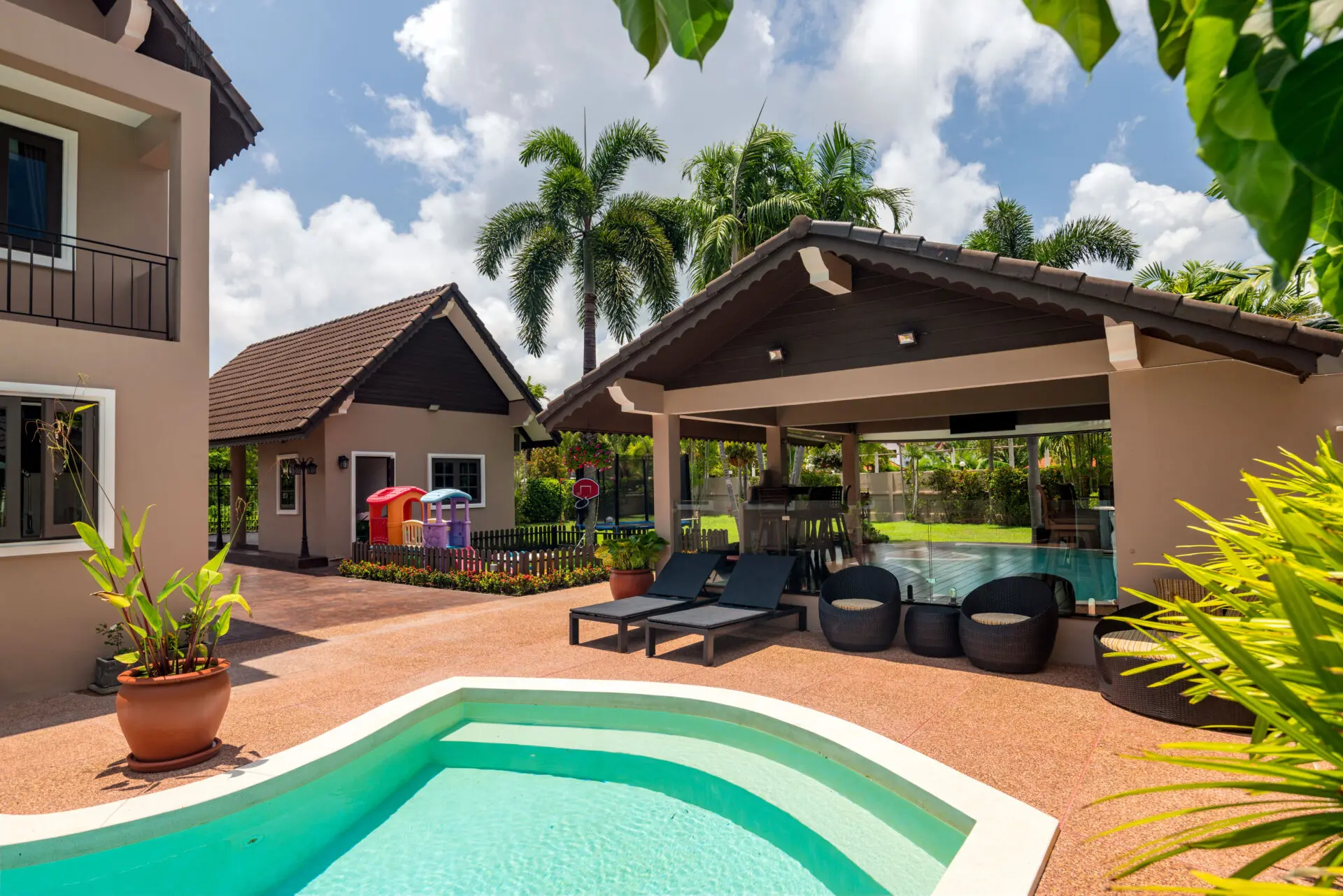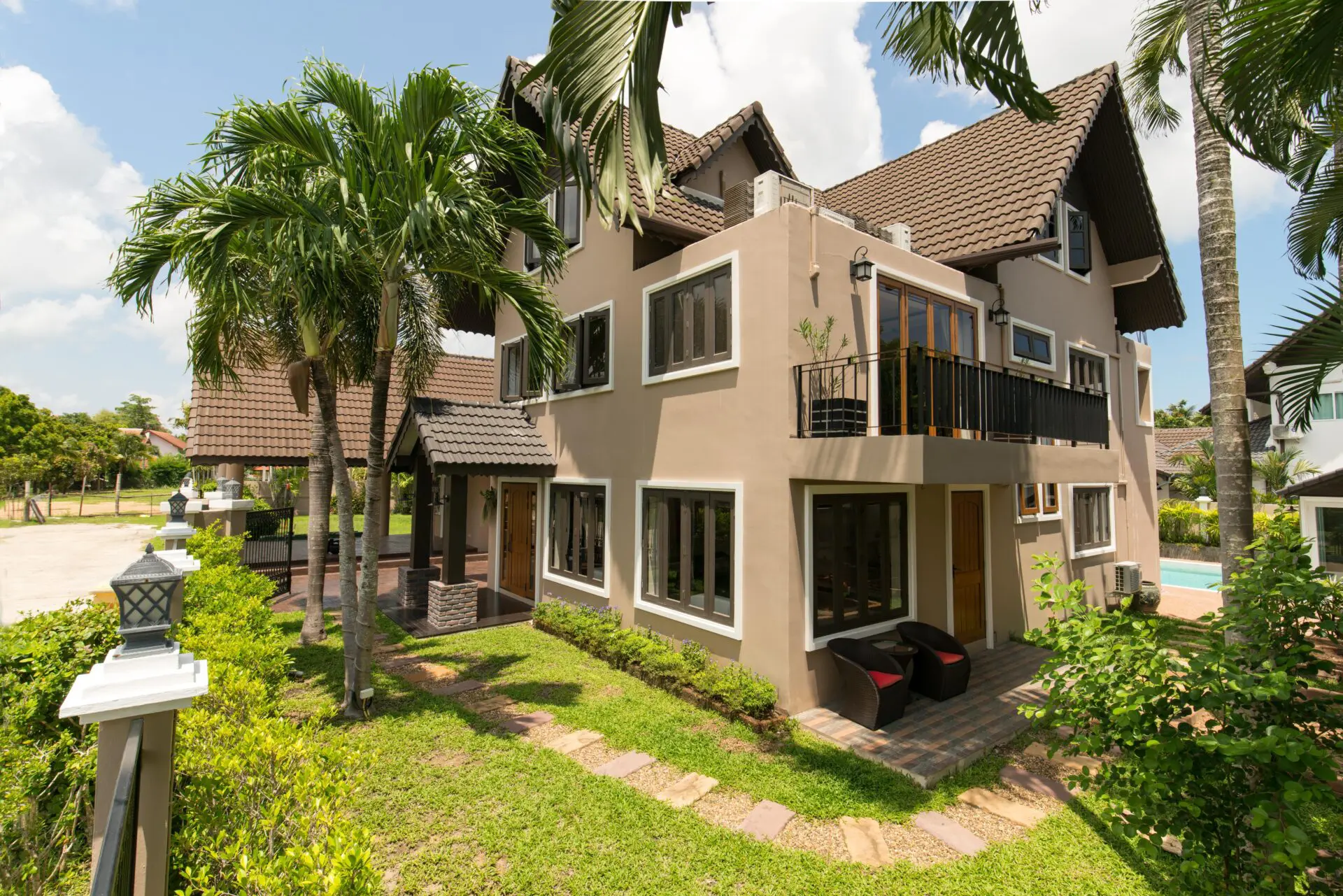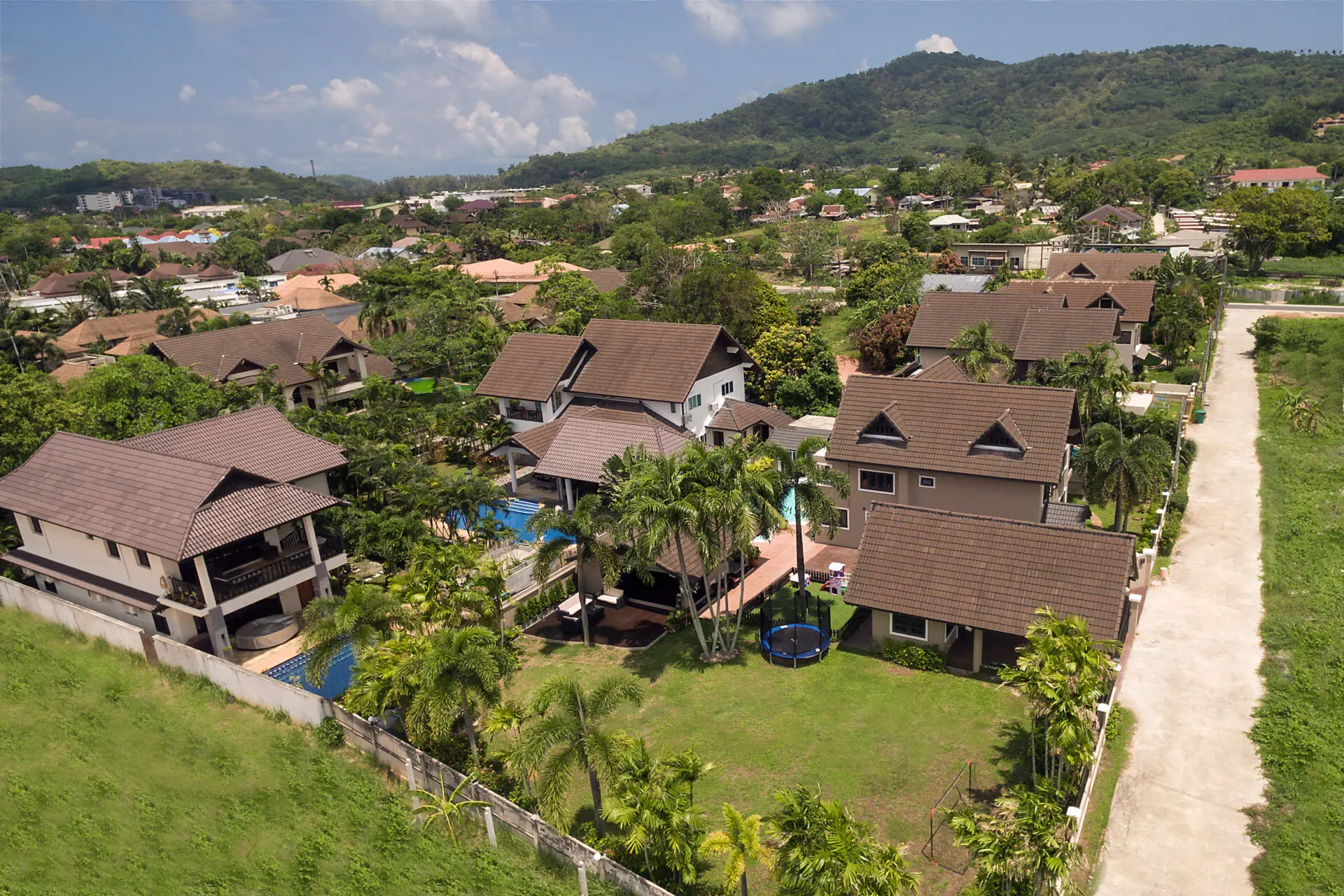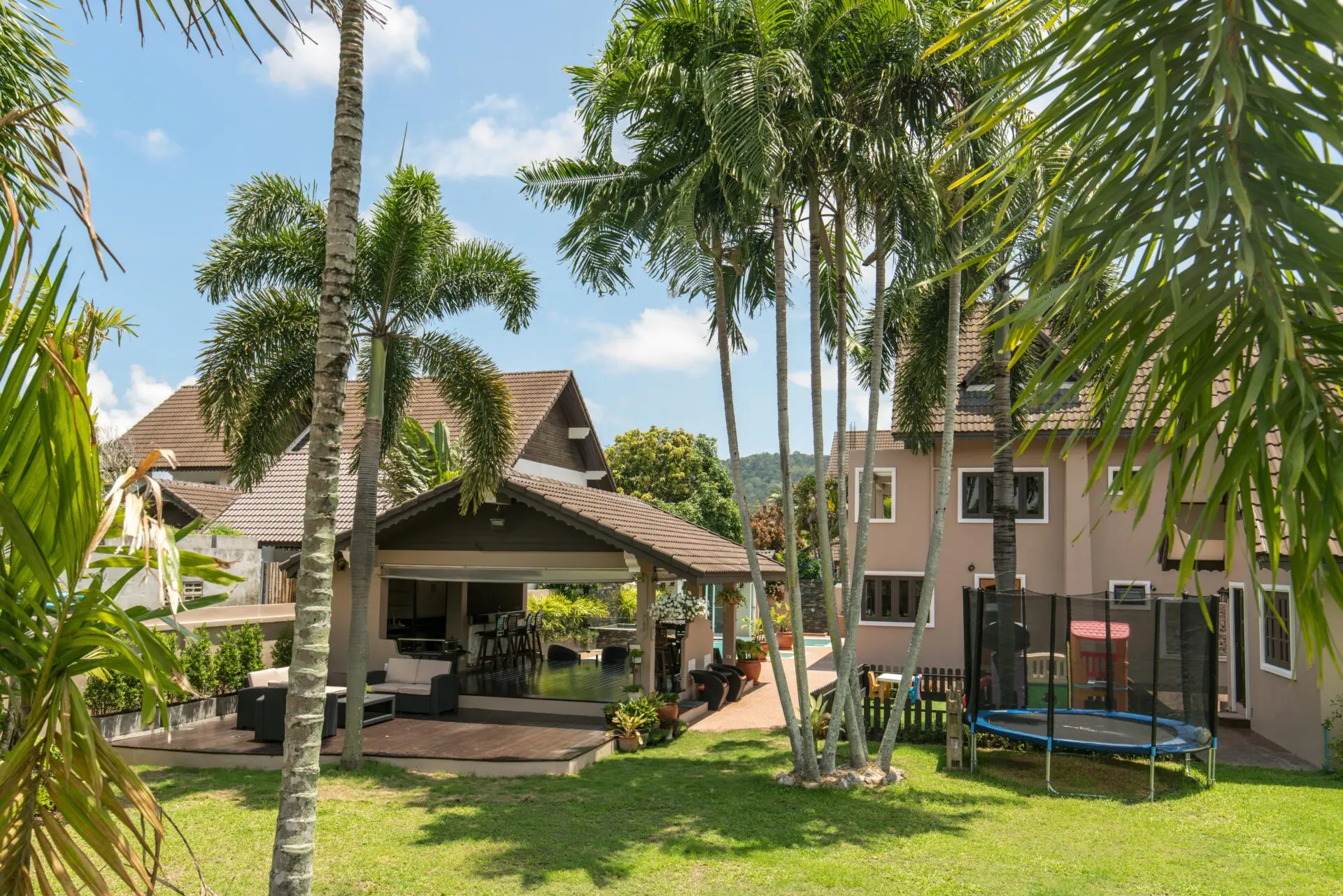 Nestled in the heart of Naiharn, within walking distance to local shops and just moments from the stunning beach, this magnificent Tudor-style family home sprawls across an impressive 1,250 square meters, boasting 5 spacious bedrooms, 4 luxurious bathrooms, two inviting living rooms, an open-plan kitchen with a separate dining room perfect for entertaining, a large private bar complete with a built-in BBQ area, a delightful kids’ play area, a rejuvenating herbal steam room, and a covered carport for two cars, all wrapped in unique Tudor architecture that stands out as potentially the most impressive family residence in all of Rawai.